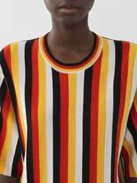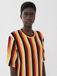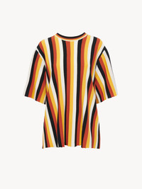 Crafted from a lower-impact wool knit, this striped T-shirt showcases four colors for a vibrant, graphic allure. The generous fit and ribbed trims make this a relaxed yet striking piece detailed with pleats. Pair it with the matching flared skirt for the full look. PRODUCT DETAILS Striped T-shirt main material: 100% Wool Care: dry cleaning only Fit: generous, short sleeves - The model is 5'10'' (178 cm) and wears a prototype in size S - Generous knit T-shirt - Slips on The wool used in this product comes from a farm that respects animal welfare, maintains soil health, protects biodiversity and promotes native species. Color: Multicolor Orange Item code: CHC23SMP165508ZA
