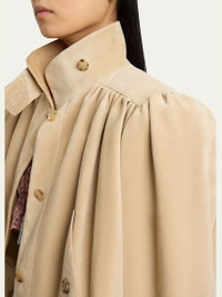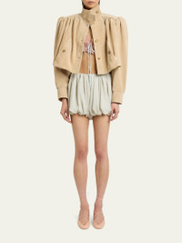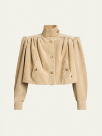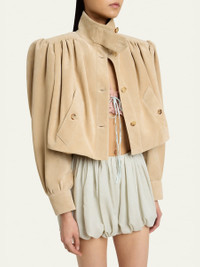 Chloe gathered boule jacket crafted from suede Gold metal Chloe logo triangle at left pocket High neckline; button front Long pleated sleeves; button cuffs Straight fit Cropped length Side pockets Suede/leather Lining: Viscose/cotton Made in Italy Online Inquiries: BGS21_B9XUV| Store Inquiries: #4997202