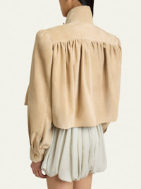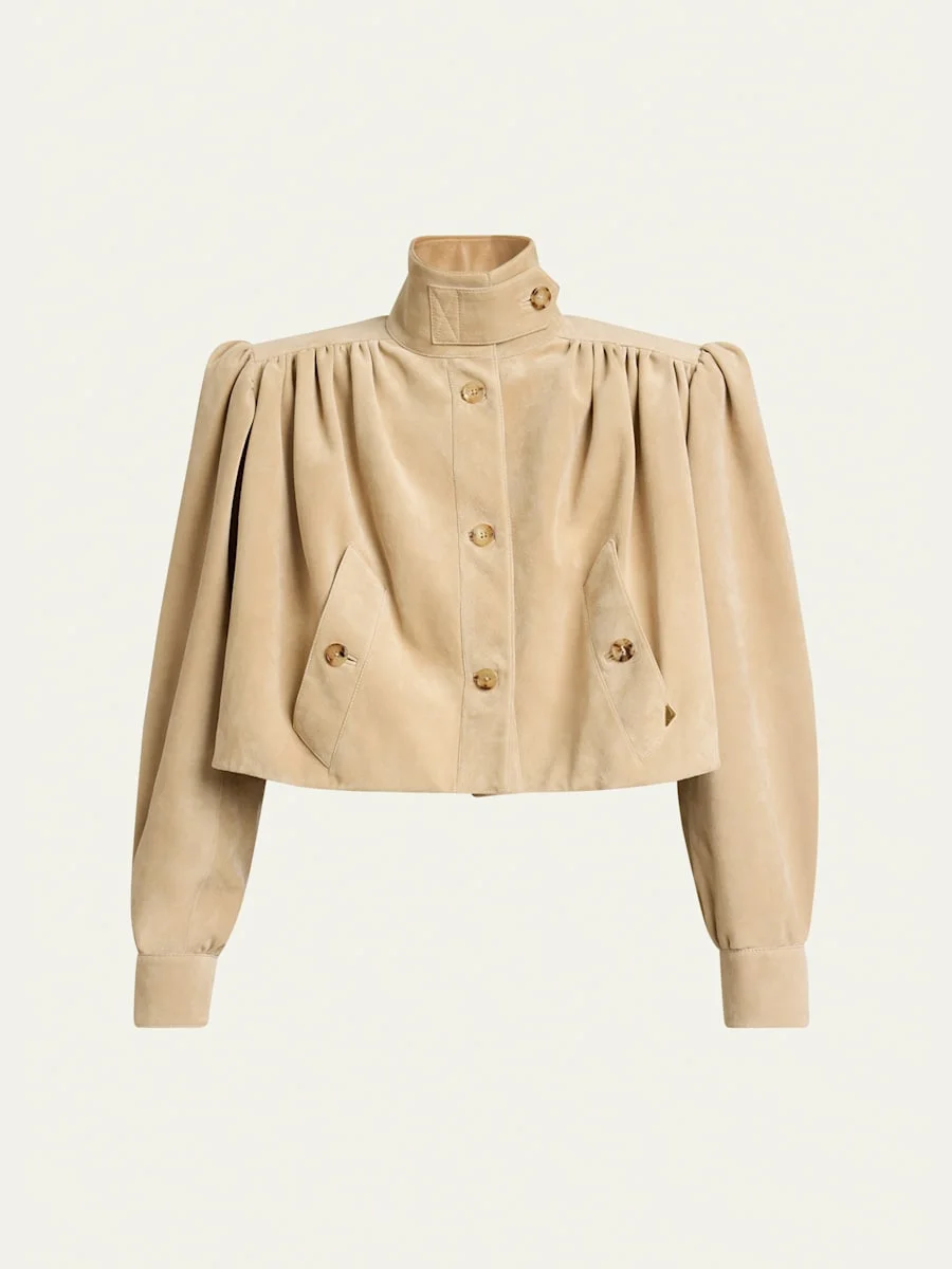 Suede High Neck Gathered Shoulder Cropped Jacket