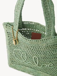 The Summer Banana tote bag was crafted from raffia and calfskin by a single artisan over 4.5 days in collaboration with Made For A Woman. The front features a handwritten signature inspired by the Chloe heritage. A dangling chain and charms finish this spacious tote. PRODUCT DETAILS Summer Banana tote bag in raffia & calfskin Main material: Cellulose paper Main lining: Cellulose paper Trim: Buffalo leather Carry: Shoulder - 2 main compartments - Magnet closure Comes with a dust bag - Width: 13" (33 cm) - Height: 14.6" (37 cm) - Depth: 0.8" (2 cm) This model has been handwoven with natural fibers, so the dimensions may slightly vary from one basket to another. - Handle drop: 7.9" (20 cm) This tote bag is made from a woven fabrication adapted to leather goods requirements. A water-repellent treatment was applied to the fabric, but rain exposure should be avoided. Avoid rubbing this material against color-contrasting materials and shield it from humidity, light, heat, liquids and greasy substances. Follow all care instructions on the insert. To make this product, Chloe worked with Leather Working Group (LWG) certified leather manufacturers. LWG certifies tanneries based on their water and energy usage, management of chemicals, solid waste, and wastewater. Made For A Woman is a social enterprise based in Madagascar that aims to empower vulnerable women, support them with living wages and help to build their life with their family. Color: Tea Leaf Green Item code: CH25US901P0838M