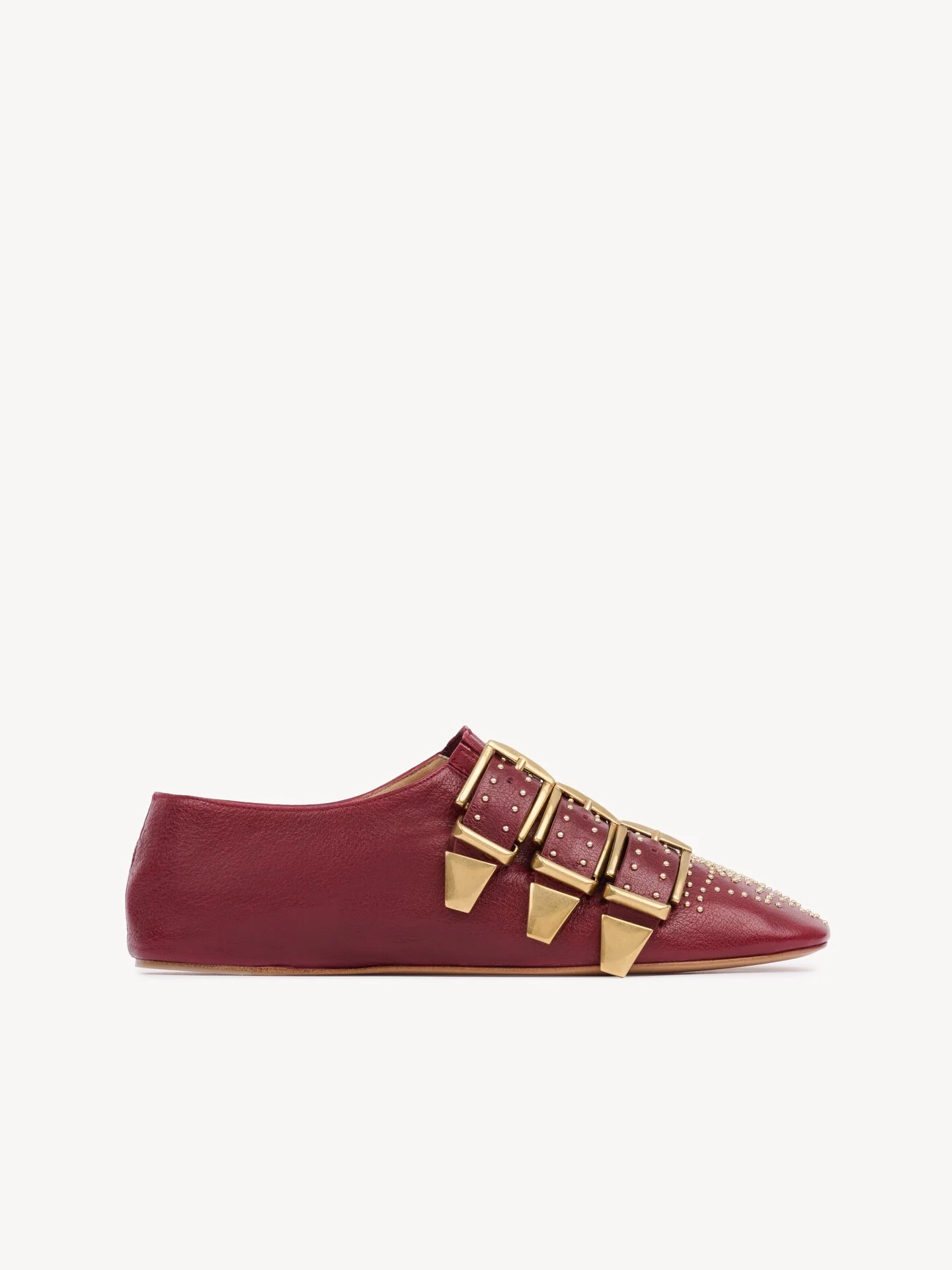 DESCRIPTION Inspired by the line's iconic boots, these Susanna flats are crafted from grained buffalo leather. The elongated upper is finished with the emblematic gold-tone studs and buckles. PRODUCT DETAILS Flat shoe Upper: buffalo leather Inner sole: lambskin Main lining: lambskin Sole: cowhide Fit true to size, European sizing - Slip-on To make this product, Chloe worked with Leather Working Group (LWG) certified leather manufacturers. LWG certifies tanneries based on their water and energy usage, management of chemicals, solid waste, and wastewater. Color: Grenat Item code: CH26S16YUR602