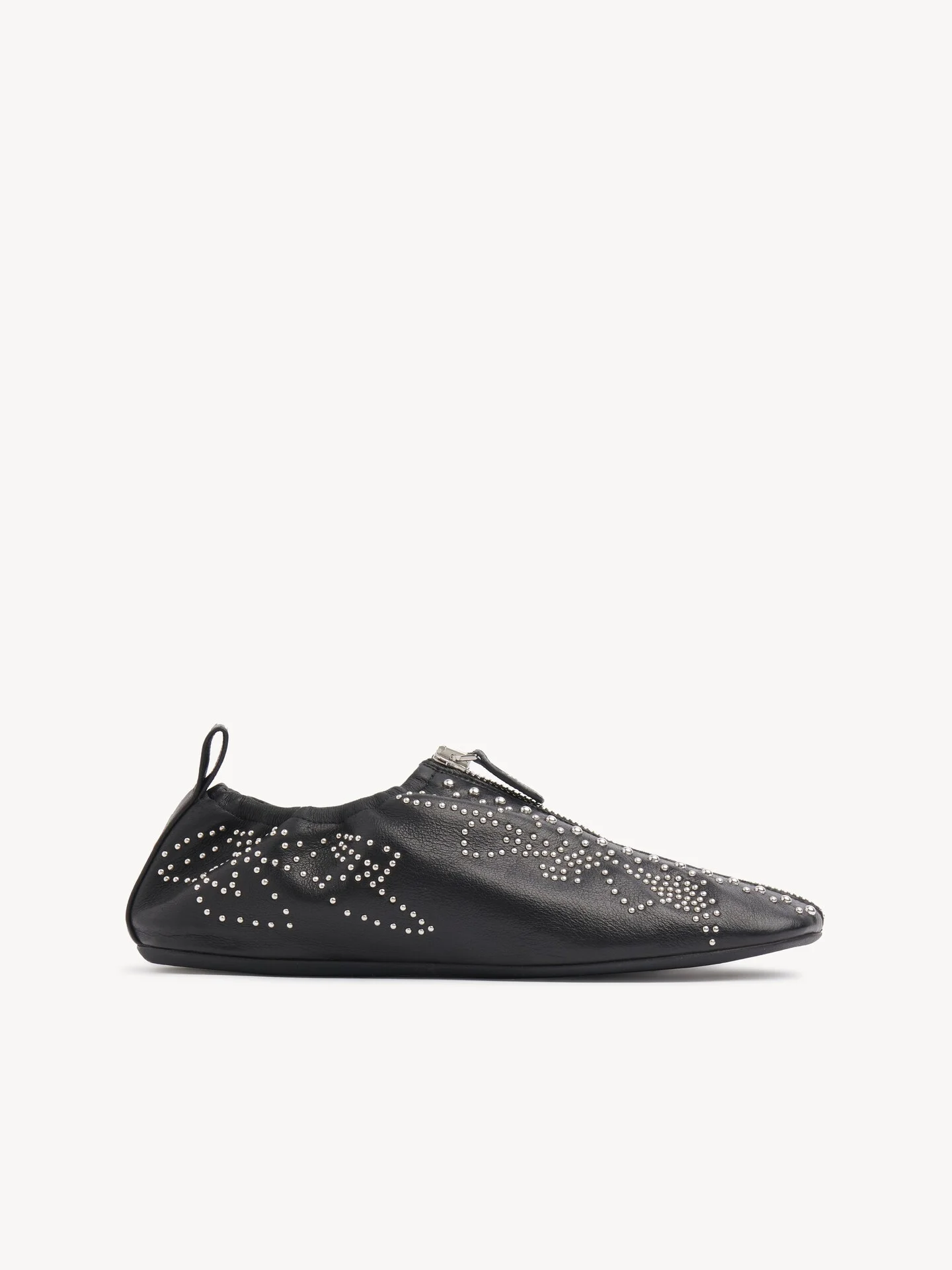 DESCRIPTION Inspired by the line's iconic boots, these Susanna flats are crafted from grained buffalo leather and finished with the emblematic silver-tone studs. The elongated upper features a central zip with a leather tab debossed with the Chloe logo. PRODUCT DETAILS Flat shoe Upper: buffalo leather Inner sole: lambskin Main lining: lambskin Sole: cowhide Fit true to size, European sizing - Zip fastening To make this product, Chloe worked with Leather Working Group (LWG) certified leather manufacturers. LWG certifies tanneries based on their water and energy usage, management of chemicals, solid waste, and wastewater. Color: Black Item code: CH26S16XUR001