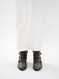 The statement Susanna short boots perfectly capture the Chloé girl's rock 'n' roll attitude. The glossy finish of the smooth and supple nappa sheepskin adds femininity, complementing the glamour of the vintage buckles and the emblematic studs. The elongated toe shape, Cuban heel and thick sole take inspiration from a cowboy design to create a striking heeled boot. PRODUCT DETAILS Short boots heel height: 1.6" (4 cm) Heel-to-toe drop: 1.2" (3 cm) - Upper: nappa sheepskin - Heel: stacked calf - Sole: calfskin - Lining: calfskin European fit: runs large, take one size smaller. - Booties - Heeled boots - Zipper fastening along side - Floral studded pattern - Trio buckled straps Color: black gold Item code: CHC16A134750ZY