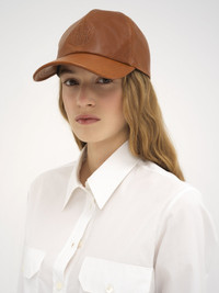 Swing cap in shiny calfskin with tonal Chloe logo embroidery linked to the Maison's ready-to-wear collection. The adjustable strap at the back ensures the perfect fit, while an engraved Chloe logo on the brass closure finishes this piece. PRODUCT DETAILS Cap in shiny calfskin with embroidery Internal lining: 100% Cotton Embroidery thread: 100% Polyester Main material: 100% Buffalo leather Ribbon: 54% Viscose, 46% Cotton - S: 22" (56 cm) - M: 22.8" (58 cm) - Adjustable strap at back Our hats are crafted artisanally in Italy and their materials are chosen with care. Any inconsistencies or color differences are inherent to this type of fiber and the artisanal process. To ensure its quality and longevity, avoid contact with water, alcohol, perfume, chlorine and abrasive surfaces. Store your hat inside a pouch or in its box, in a dry area. To make this product, Chloe worked with Leather Working Group (LWG) certified leather manufacturers. LWG certifies tanneries based on their water and energy usage, management of chemicals, solid waste, and wastewater. Color: Clay Brown Item code: CHC24AD099CUB26M