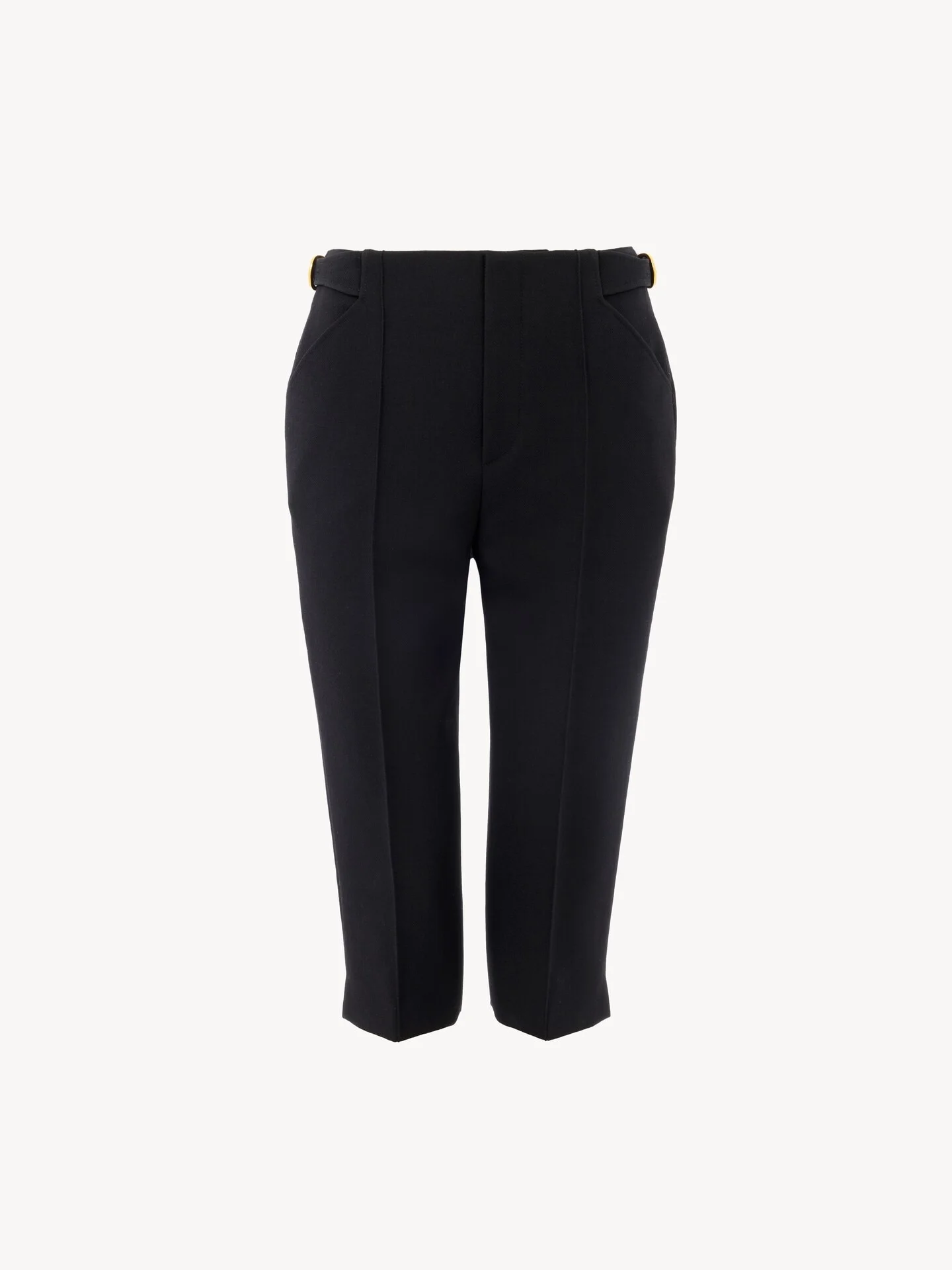 DESCRIPTION Tailored capri pants in lower-impact wool crepe, featuring raised seams and side tabs with gold-tone buckles. PRODUCT DETAILS Capri pants outer shell: 100% Wool Pocket lining: 100% Cotton Inside button: 100% Water buffalo horn Fit: slim - The model is 5'10" (178 cm) and wears a prototype in size 36 - Slim capri pants - Front hook & zipper fastening - Engraved horn internal button - Side pockets - Piped back pockets - Buckled side tabs The wool used in this product comes from a farm that respects animal welfare, maintains soil health, protects biodiversity and promotes native species. Color: Black Item code: CH26SPA15061001 CARE INSTRUCTIONS To preserve the integrity of your garment, please refrain from washing, entrusting its care to professional cleaning services for optimal maintenance. This garment cannot withstand any bleaching agent. To maintain its shape, gently iron this garment at a maximum sole plate temperature of 110°C, taking care to avoid any harsh pressure while ironing. Entrust this garment to a specialist for mild cleaning with tetrachloroethylene and solvent F, ensuring its delicate nature is maintained with the most care. To best preserve its form and texture, please do not tumble dry this garment. To maintain its delicate nature, do not wet clean this garment. TRACEABILITY Better traceability is central to improving our materials as well as social and environmental practices. Dyeing: Italy Finishing: Italy Weaving: Italy