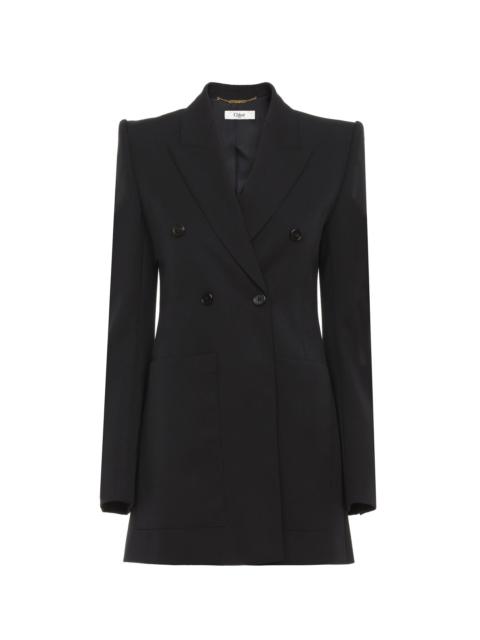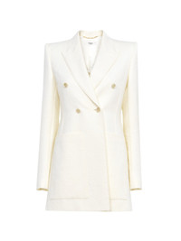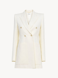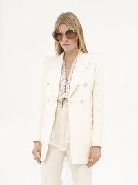 Double-breasted tailored jacket in a cotton-mix quilted jacquard, with engraved horn buttons and maxi patch pockets. PRODUCT DETAILS Double-breasted tailored jacket outer shell: 68% Cotton, 32% Polyamide Lining: 100% Silk Buttons: 100% Horn Fit: tailored - The model is 5'10" (178 cm) and wears a prototype in size 36 - Tailored white jacket - Engraved horn buttons at front & cuffs - Maxi front patch pockets Care: dry cleaning only Color: Coconut Milk Item code: CH25UVE30426103
