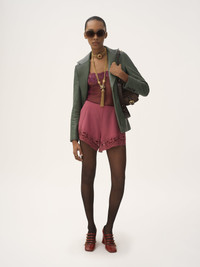 Single-breasted tailored jacket in soft lambskin, featuring engraved horn buttons and patch pockets. PRODUCT DETAILS Tailored jacket outer shell: 100% Lambskin Main lining: 62% Viscose, 38% Cotton Pocket lining: 100% Cotton Fit: tailored - The model is 5'10" (178 cm) and wears a prototype in size 34 - Tailored leather jacket - Engraved horn button at front - 4 engraved horn buttons at each cuff - Chest patch pockets - Front patch pockets To make this product, Chloe worked with Leather Working Group (LWG) certified leather manufacturers. LWG certifies tanneries based on their water and energy usage, management of chemicals, solid waste, and wastewater. Color: Dusty Leaf Item code: CH25ACV332043F6