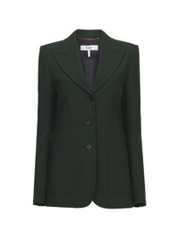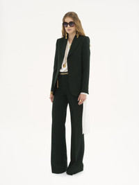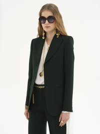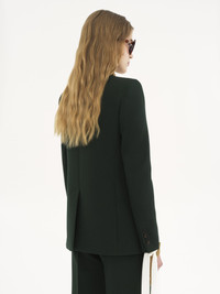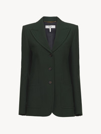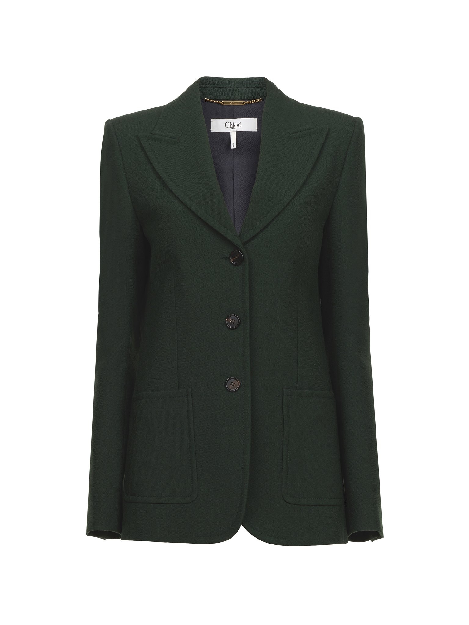 Single-breasted tailored jacket in lower-impact wool crepe, with engraved horn buttons and front pockets. PRODUCT DETAILS Single-breasted tailored jacket outer shell: 100% Wool Lining: 100% Silk Buttons: 100% Horn Fit: tailored - The model is 5'10" (178 cm) and wears a prototype in size 36 - Tailored wool jacket - Engraved horn buttons - Front flap pockets Care: dry cleaning only The wool used in this product comes from a farm that respects animal welfare, maintains soil health, protects biodiversity and promotes native species. Color: Nightfall Green Item code: CH25SVE513023M6