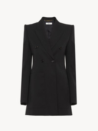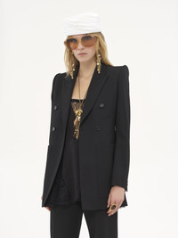 Double-breasted tailored jacket in lower-impact wool grain de poudre, with engraved horn buttons and maxi patch pockets. PRODUCT DETAILS Double-breasted tailored jacket outer shell: 100% Wool Lining: 100% Silk Buttons: 100% Horn Fit: tailored - The model is 5'10" (178 cm) and wears a prototype in size 36 - Tailored wool jacket - Engraved horn buttons at front & cuffs - Maxi front patch pockets Care: dry cleaning only The wool used in this product comes from a farm that respects animal welfare, maintains soil health, protects biodiversity and promotes native species. Color: Black Item code: CH25UVE30067001