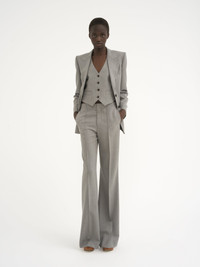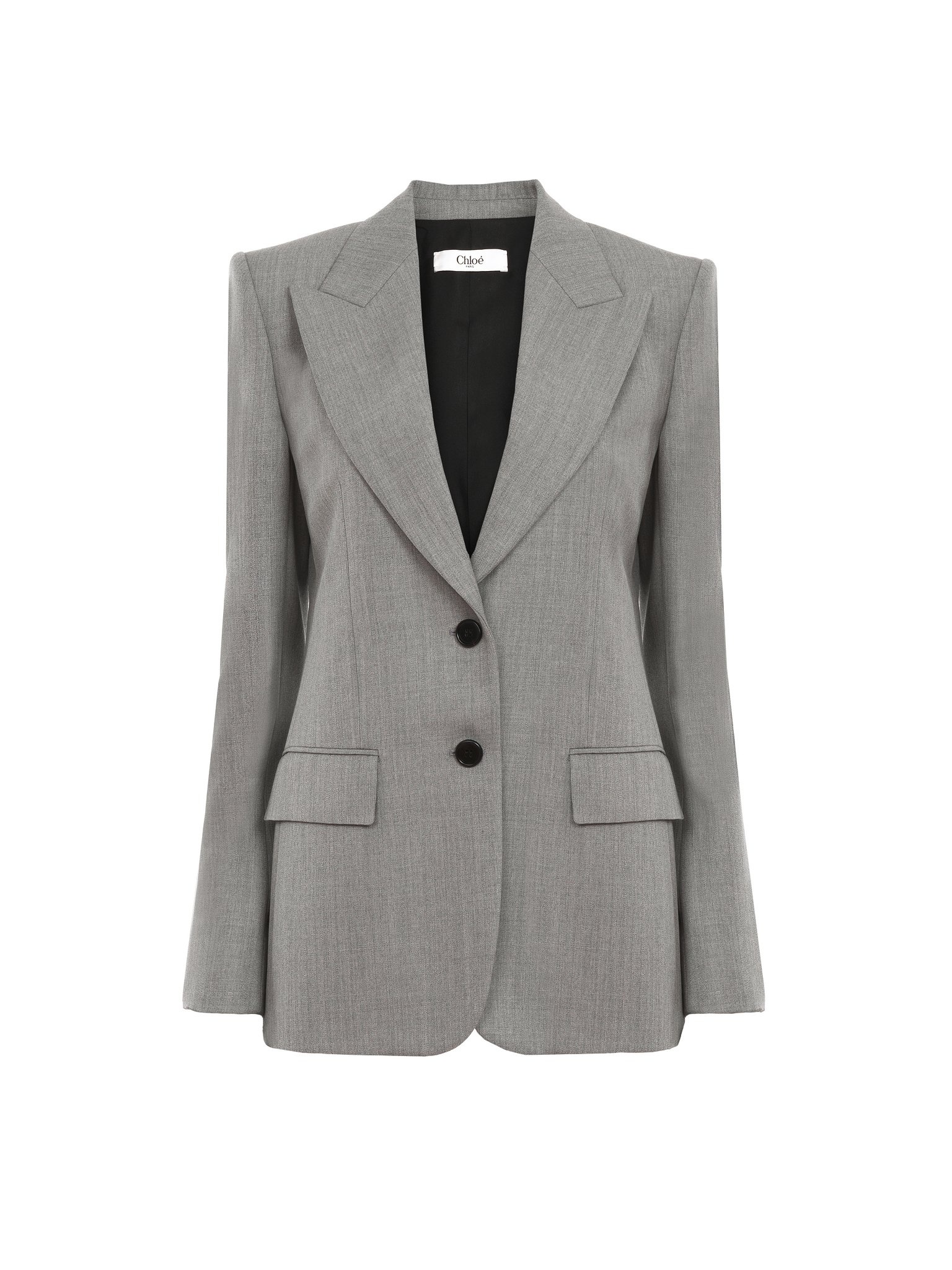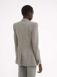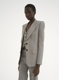 Slim-fit single-breasted tailored jacket in chiné wool grain de poudre, featuring a peak lapel and two horn buttons. PRODUCT DETAILS Tailored jacket outer shell: 100% Virgin wool Lining: 100% Silk Buttons: 100% Water buffalo horn Care: dry cleaning only Fit: tailored - The model is 5'10" (178 cm) and wears a prototype in size 36 - Single-breasted jacket - Horn buttons at front - Flap pockets - Back vent Color: Swan Grey Item code: CHC24AVE1006801J