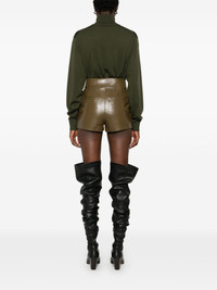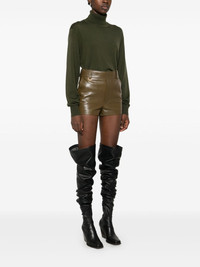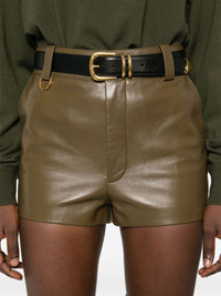leather shorts Highlights - Olive green - Lambskin - Smooth grain - Concealed front button, hook and zip fastening - High waist - Belt loops - Two side slash pockets - D-shape keyring attachment - Two rear welt pockets - Full lining - Thigh-length Made in Italy Composition Lining: Cotton 100%, Viscose 52%, Cupro 48% Outer: Lambskin 100% SIZE & FIT Model measurements Height 5 ft 11 in(1.8 m) Bust/Chest 32.67 in(83 cm) Hips 36.22 in(92 cm) Waist 24.4 in(62 cm) FittingInformation Designed for a slim fit that sits just away from the body offering a close yet comfortable fit Soft leather has a supple and smooth construction offering some flexibility Washing instructions Specialist Cleaning