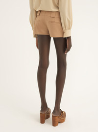 Low-waisted tailored mini shorts in lower-impact wool grain de poudre. PRODUCT DETAILS Mini shorts outer shell: 100% Virgin wool Pocket lining: 51% Viscose, 49% Cotton Care: dry cleaning only Fit: mini - The model is 5'10" (178 cm) and wears a prototype in size 36 - Tailored wool shorts - Hidden front zipper & hook - Side pockets - Piped back pockets - Maxi belt loops The wool used in this product comes from a farm that respects animal welfare, maintains soil health, protects biodiversity and promotes native species. Color: Mustard Brown Item code: CHC24ASH01061208