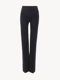 Tailored pants in lower-impact wool gabardine, featuring raised seams, slit hems and a gold-tone D-ring at the back. PRODUCT DETAILS Tailored pants outer shell: 100% Virgin wool Lining: 100% Cotton Button: 100% Water buffalo horn Fit: tailored - The model is 5'10" (178 cm) and wears a prototype in size 34 - Slit-hem pants - Front hook & zipper fastening - Horn internal button - Piped front & back pockets - Gold-tone D-ring The wool used in this product comes from a farm that respects animal welfare, maintains soil health, protects biodiversity and promotes native species. This piece was created in collaboration with Chize Confection. A long-standing partner of Chloe, Chize Confection is a Societe Cooperative de Production (SCOP). This cooperative model is distinguished by its democratic governance, fostering a collaborative and democratic working environment. Chloe has signed a contract to financially support Chize Confection with projects that will benefit its employees. Color: Ink Navy Item code: CH25WPA031614C3