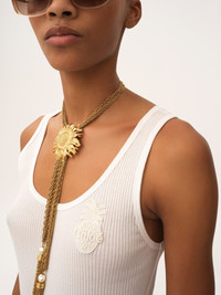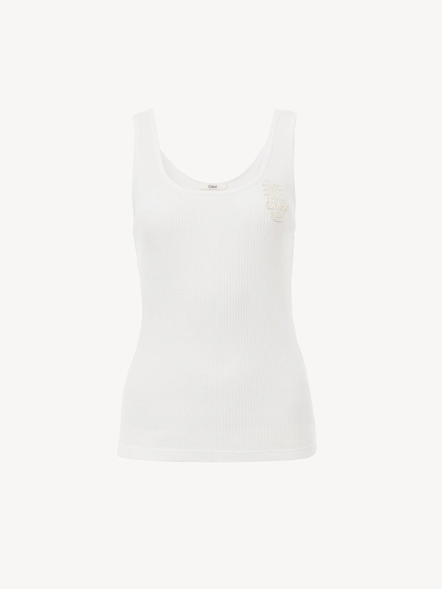 DESCRIPTION Fitted tank top in cotton jersey, featuring a Chloe logo pineapple patch at the chest. PRODUCT DETAILS Tank top outer shell: 100% Cotton Fit: fitted - The model is 5'10" (178 cm) and wears a prototype in size S - Chloe top - Slips on Color: White Item code: CH25AJH12176101 CARE INSTRUCTIONS Entrust this garment to a specialist for cleaning with hydrocarbons, ensuring its delicate nature is maintained with the most care. To preserve the integrity of your garment wash it by hand at a maximum of 40°C, ensuring its delicate fibers are treated with care. This garment cannot withstand any bleaching agent. To maintain its shape, gently iron this garment at a maximum sole plate temperature of 110°C, taking care to avoid any harsh pressure while ironing. To maintain its delicate nature, do not wet clean this garment. To best preserve its form and texture, dry this garment flat. To best preserve its form and texture, please do not tumble dry this garment. TRACEABILITY Better traceability is central to improving our materials as well as social and environmental practices. Dyeing: Portugal Knitting: Portugal
