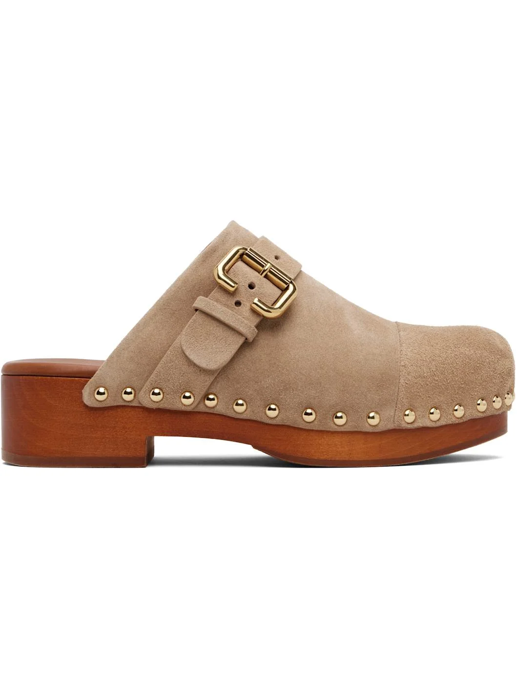 LWG-certified calfskin suede clogs. · Pin-buckle strap at vamp · Buffed calfskin lining · Studs at welt · Wood midsole and block heel · Rubber sole · Heel: H1.75" Supplier color: Desert Sand Upper: calfskin. Sole: wood, rubber. Made in Italy 261338F121001