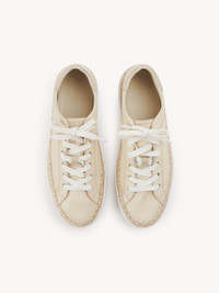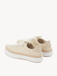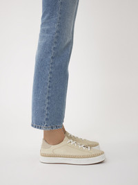Made from soft nappa calfskin for comfort and flexibility, this Telma sneaker is a fresh, lightweight style that strikes a dynamic balance between classic Chloé codes and an inspired take on new adventures. The original outsole features a nautical rope pattern, complementing the sneaker's natural tones and outdoor attitude. Subtle stitches and the delicate contrast of natural espadrille rope showcase the Maison's distinctive craftsmanship, lending authentic detail and a feminine finish. The heel is signed with Chloé logo embroidery. PRODUCT DETAILS Flat sneaker - Inner sole: ethylene vinyl acetate - Main lining: 95% polyester, 5% elastane - Secondary lining: sheepskin - Sole: 50% ethylene vinyl acetate, 50% rubber - Upper 1: cowhide - Upper 2: cowhide - Upper 3: polyester Fit true to size, European sizing - Lace-up low-top sneaker To make this product, Chloé worked with Leather Working Group (LWG) certified leather manufacturers. LWG certifies tanneries based on their water and energy usage, management of chemicals, solid waste, and wastewater. The polyester we use is made of recycled plastic, sourced mainly from water bottles. Color: Pearl Item code: CHC24S994HG105