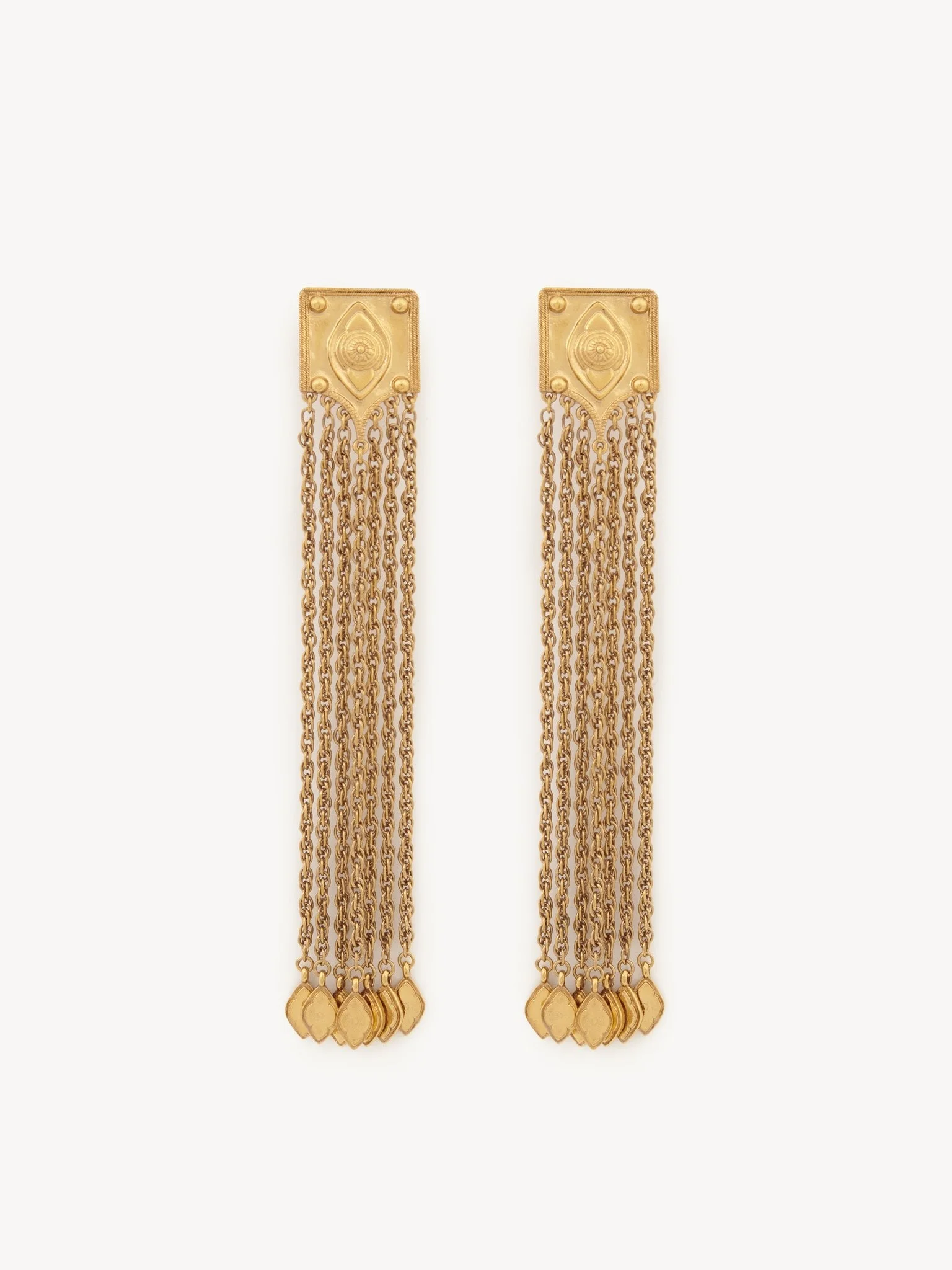 Chloe Amulet dangling earrings in vintage gold brass with smooth and hammered textures for a hand-made feel. Delicate chains finished with decorative tips are set on an ornamental square base. The Chloe Iconic signature adorns a single outer chain. PRODUCT DETAILS Dangling earrings in 100% brass - One size only - Pin & clip closure - Suitable for pierced ears only - Chloe Iconic signature Color: Vintage Gold Item code: CH25AJE06CB79DC