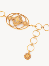 DESCRIPTION Chloe Amulet jewelry belt in vintage gold brass, featuring round links and a meticulously cut, statement ornamental buckle. A matching pendant dangles along the leg. Signed by a Chloe logo engraving, the adjustable chain has a hook closure. PRODUCT DETAILS Jewelry belt in 100% brass - One size only - Adjustable - Hook closure - Chloe logo engraving - Wear high on waist or low on hips Color: Vintage Gold Item code: CH25ABJ10CB79DC CARE INSTRUCTIONS To ensure this item's quality and longevity, wear it regularly and avoid exposure to direct sunlight and heat. Avoid impact, and contact with water, perfume or chlorine. Store your jewel in its pouch and box when not in use.