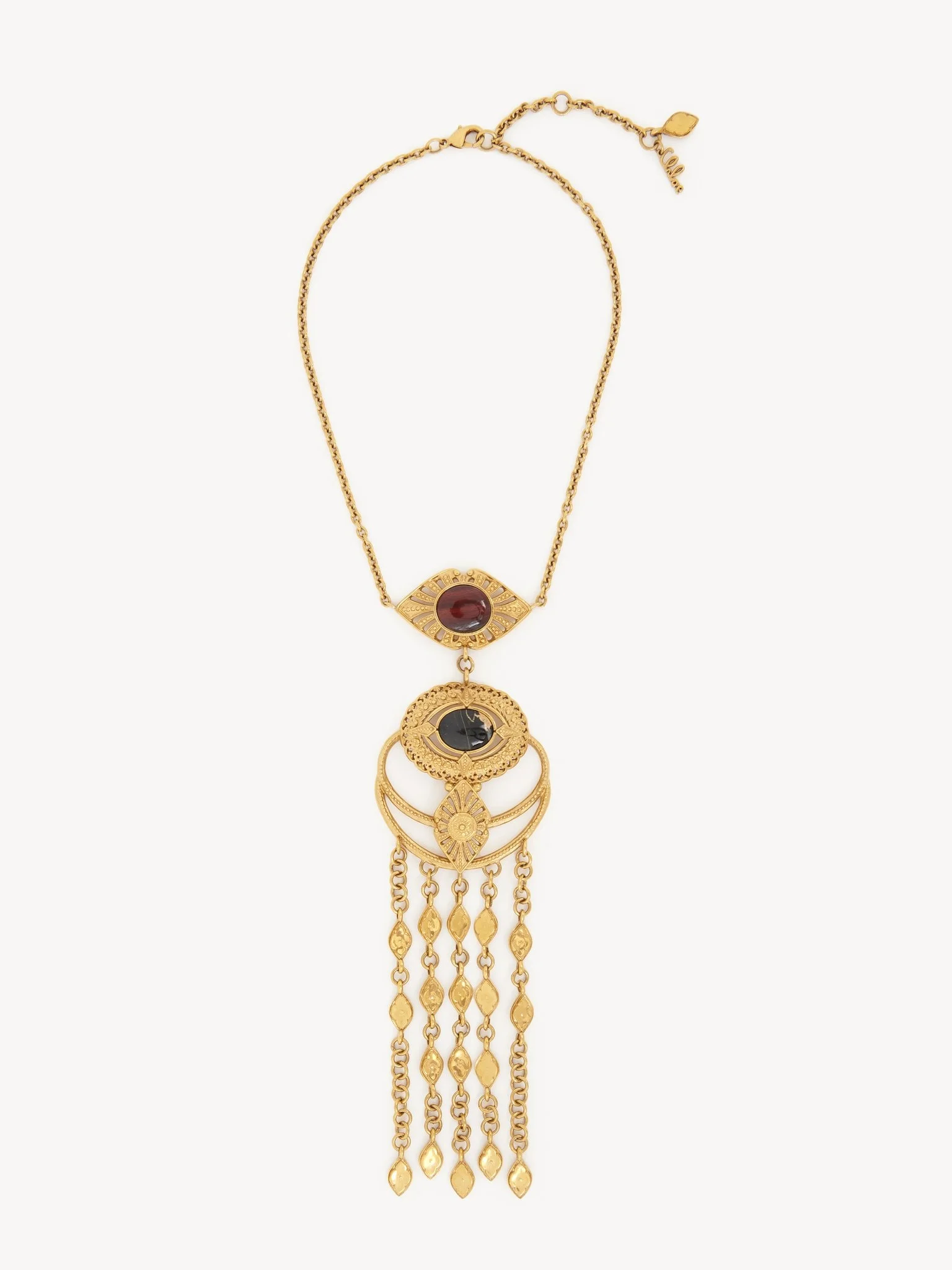Chloe Amulet necklace in gold brass. Ornamental pendants elevate delicately cut brass with natural red jasper and Portoro marble stones. Dangling chains are set with decorative pieces, while the Chloe Iconic signature finishes this necklace. PRODUCT DETAILS Necklace in brass, red jasper & Portoro marble - One size only - Adjustable - Chloe Iconic signature Color: Gold & Red Item code: CH25AJN19BJM7ZJ
