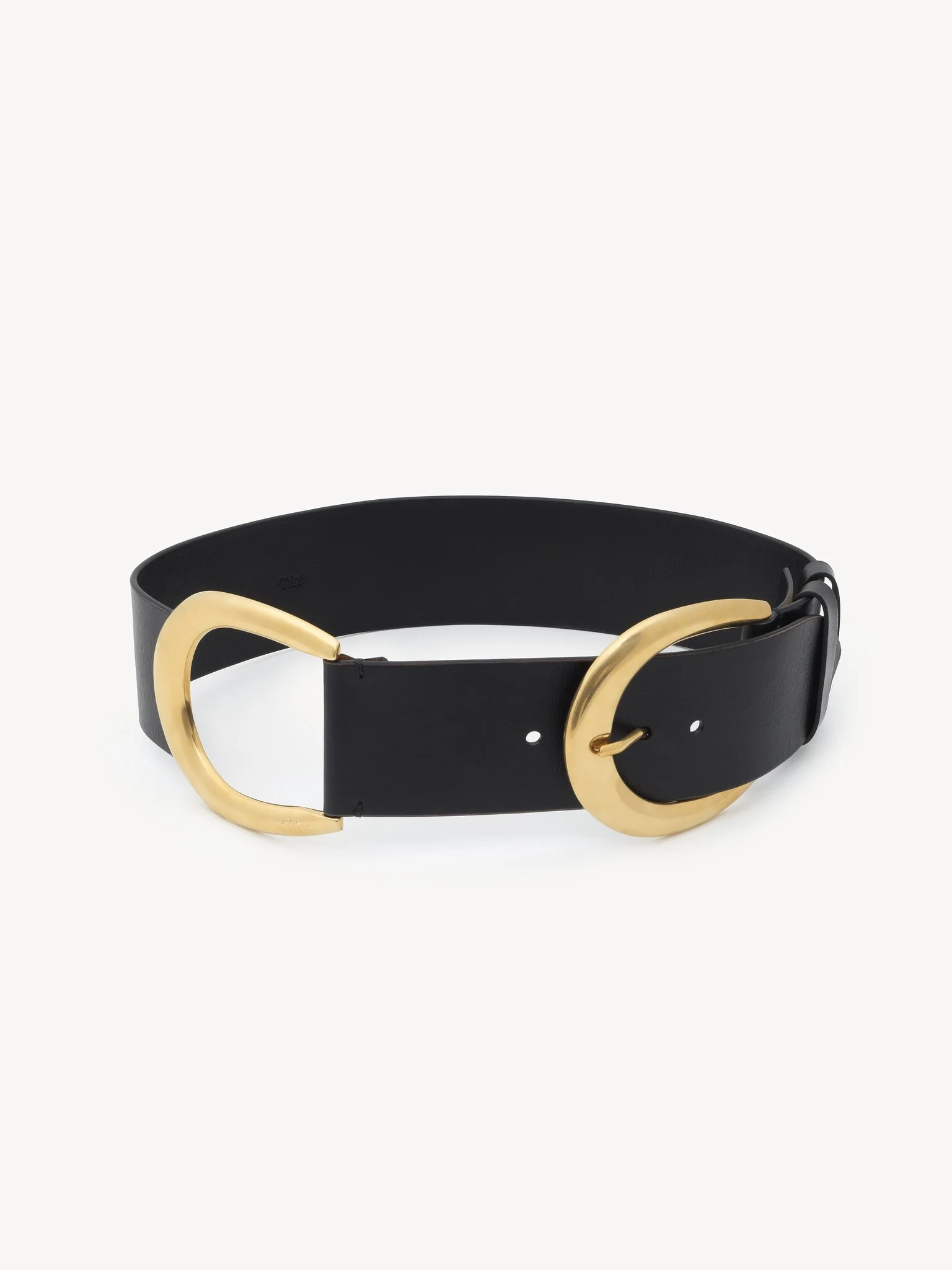 Chloe Anita leather belt in vintage-effect cowhide with an extra-large gold-tone link and buckle, rooted in the Maison's heritage and signed with a Chloe logo engraving. PRODUCT DETAILS Leather belt in cowhide & zamak - S: 33.5" (85 cm) - M: 35.4" (90 cm) - L: 37.4" (95 cm) Width: 2.9" (7.3 cm) - Buckle closure & adjustment holes - Chloe logo engraving - Wear low on the hips Color: Black Item code: CH25WBB04CWZ001