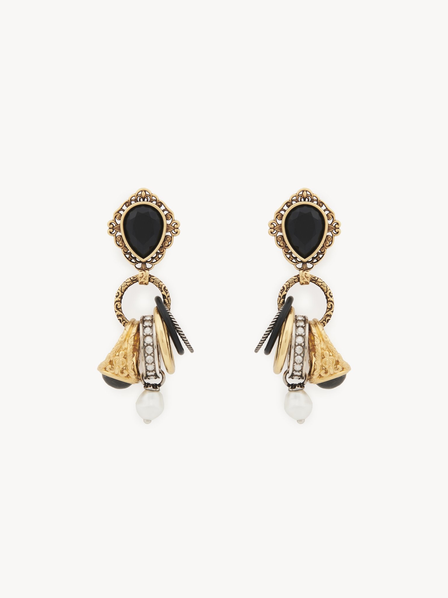 Chloe Antique Pearls dangling earrings in meticulously cut vintage gold brass, resin, Portoro marble and crystal glass. The ornamental design showcases a black faceted teardrop and a cluster of five rings with different textures and embellishments. The combination of gold and palladium tones nods to the Chloe DNA. PRODUCT DETAILS Dangling earrings in brass, resin, Portoro marble & crystal glass - One size only - Pin & clip closure - Suitable for pierced ears only Color: Gold, Palladium & Black Item code: CH25AJE14BRM7ZL