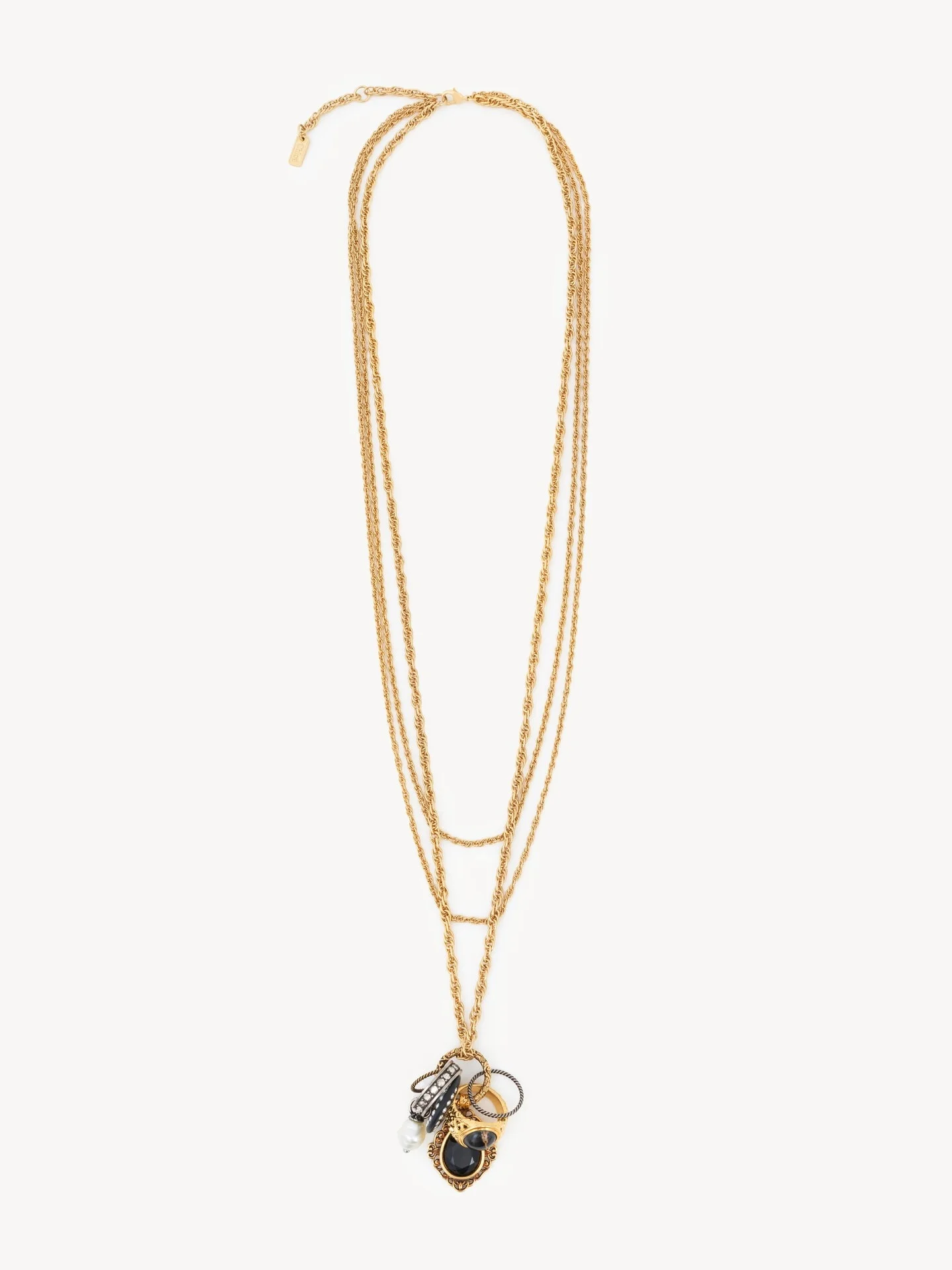 DESCRIPTION Chloe Antique Pearls layered pendant necklace combining a triple gold brass chain with an ornamental black faceted teardrop pendant and a cluster of five rings with different textures and embellishments. Portoro marble, resin pearls and crystal glass elevate the combination of gold and palladium tones rooted in the Chloe DNA. PRODUCT DETAILS Layered pendant necklace in brass, resin, Portoro marble & crystal glass - One size only - Adjustable - Chloe logo engraving & plate Color: Gold, Palladium & Black Item code: CH25AJN77BRM7ZL CARE INSTRUCTIONS To ensure this item's quality and longevity, wear it regularly and avoid exposure to direct sunlight and heat. Avoid impact, and contact with water, perfume or chlorine. Store your jewel in its pouch and box when not in use.