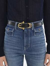 Chloe Bracelet belt in soft calfskin featuring striking brass hardware in gold and silver tones, anchored in the Maison's DNA. The buckle is linked to the Paraty 24 bag, while the cluster of three rings nods to the iconic Bracelet bag. A Chloe logo engraving signs this piece. PRODUCT DETAILS Bracelet belt in soft calfskin & brass Lining: Soft calfskin - Sizes: S, M, L - 5 adjustment holes - Width: 1" (25 mm) - Chloe logo engraving on silver ring This belt is made from calfskin. The leather is chosen with care and crafted artisanally in our workshops in Italy. Our leathers have a richness that makes them unique (patina, color variations, marks, distinctive features, etc.). For optimal quality and durability, wear your belt regularly. Avoid exposure to direct sunlight and heat. Avoid contact with water, alcohol, perfume, chlorine and abrasive surfaces. Store your belt inside a pouch or in its box. Leather specialist cleaning only. To make this product, Chloe worked with Leather Working Group (LWG) certified leather manufacturers. LWG certifies tanneries based on their water and energy usage, management of chemicals, solid waste, and wastewater. To ensure this item's quality and longevity, wear it regularly and avoid exposure to direct sunlight and heat. Avoid impact, and contact with water, perfume or chlorine. Store your jewel in its pouch and box when not in use. Color: Black Item code: CHC25SC004SFB001