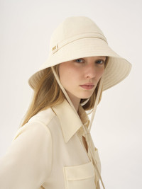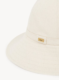 Chloe Breeze asymmetrical bucket hat in deadstock cotton. The toggle ties ensure a secure fit, while a gold-tone Chloe logo plate signs the base. The top-stitched wide brim can be worn straight or turned up. PRODUCT DETAILS Bucket hat in cotton - S: 22" (56 cm) - M: 22.8" (58 cm) - Metal Chloe logo plate This product is made using deadstock: leftover materials transformed into new products to decrease the production of new materials and lower our environmental footprint. The quality remains the same, but the environmental impact is reduced. We favor the use of deadstock, since reusing an existing material is always more sustainable than spending resources to produce a new one. Color: Soft Beige Item code: CH25AHB03CTN294