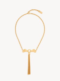 DESCRIPTION Chloe Chain Horse necklace in vintage gold brass. Inspired by the Maison's heritage, it features two horse heads on either side of a horsebit, with a dangling chain tassel. A gold-tone Chloe logo plate signs this piece. PRODUCT DETAILS Necklace in 100% brass - One size only - Adjustable - Metal Chloe logo plate Color: Vintage Gold Item code: CH26SJN06CB79DC