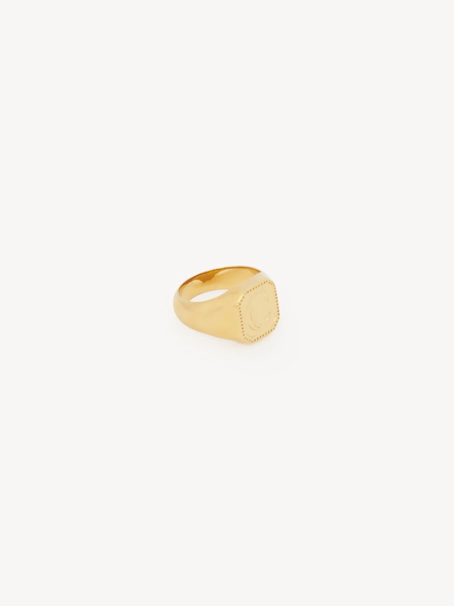 Chloe Charms ring in vintage gold brass. Contoured by lace-effect detail, the signature "C" is rooted in the Maison's heritage. A Chloe logo engraving signs this piece. PRODUCT DETAILS Ring in 100% brass - 3 sizes: 52, 54, 56 - Chloe logo engraving To ensure this item's quality and longevity, wear it regularly and avoid exposure to direct sunlight and heat. Avoid impact, and contact with water, perfume or chlorine. Store your jewel in its pouch and box when not in use. Color: Vintage Gold Item code: CHC25SFR81CB79DC