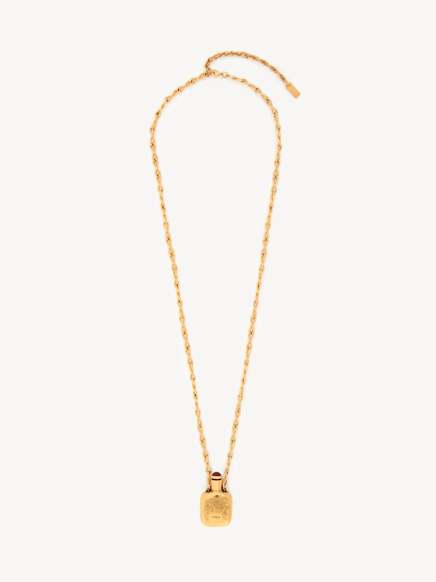 DESCRIPTION Chloe Elixir pendant necklace in vintage gold brass, featuring an ornamental square vial set on an infinity chain. A resin stone adorns the cap. A Chloe logo engraving signs the pendant, while a gold-tone Chloe logo plate finishes the chain. PRODUCT DETAILS Pendant necklace in brass & resin - One size only - Adjustable - Metal Chloe logo plate Color: Vintage Gold Item code: CH25WJN08RSB9DC CARE INSTRUCTIONS To ensure this item's quality and longevity, wear it regularly and avoid exposure to direct sunlight and heat. Avoid impact, and contact with water, perfume or chlorine. Store your jewel in its pouch and box when not in use.