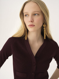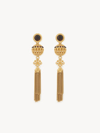 Chloe Eternity dangling earrings in vintage gold brass, combining chain tassels with an openwork sphere, ornamental pieces and brown obsidian studs. A Chloe logo engraving signs these earrings. PRODUCT DETAILS Dangling earrings in brass & brown obsidian - One size only - Pin closure - Suitable for pierced ears only - Chloe logo engraving Color: Gold & Brown Item code: CH25WJE10BBO9AH