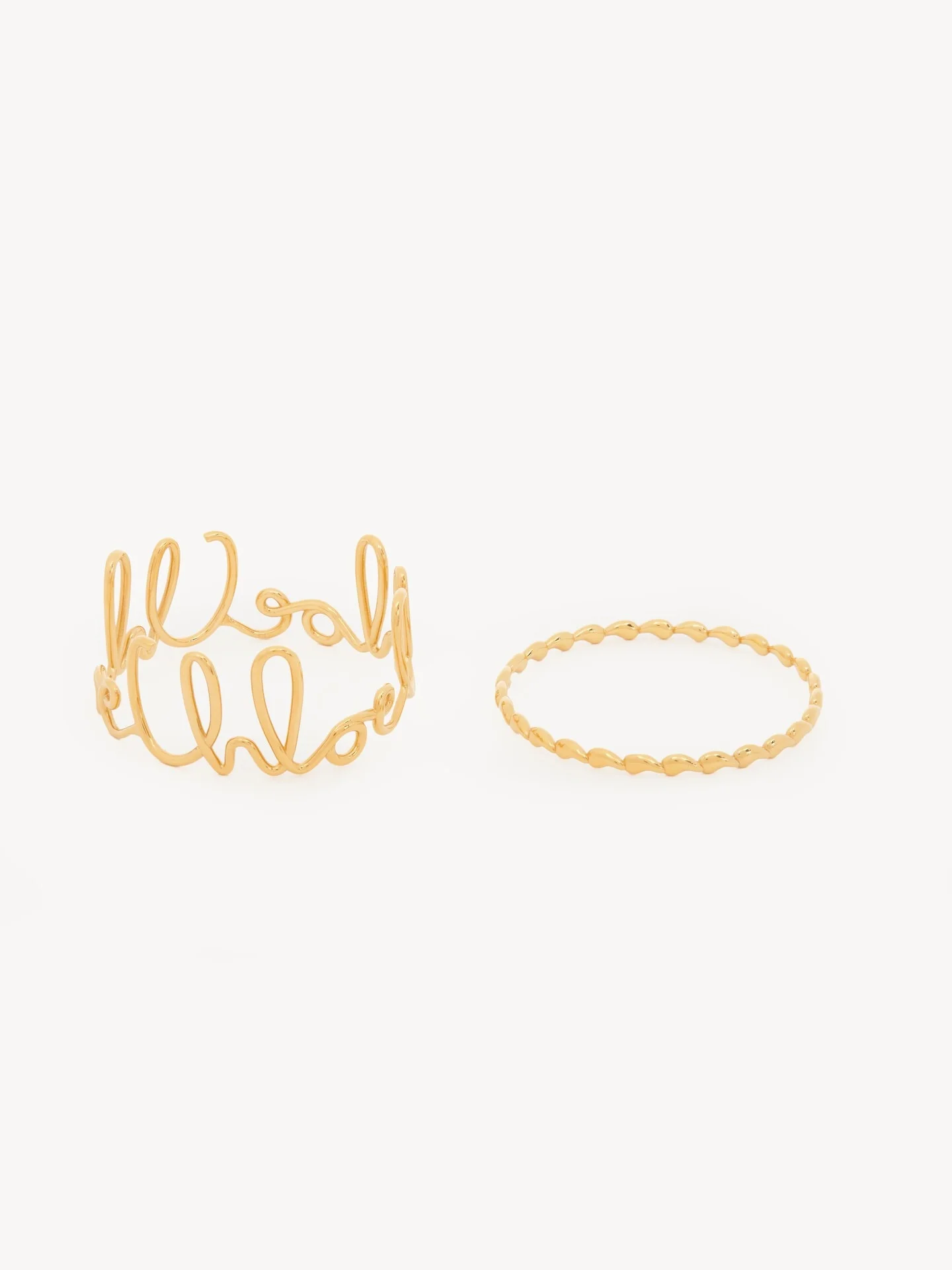 DESCRIPTION Set of two stiff Chloe Iconic bracelets in vintage gold brass. One features the Chloe signature inspired by a heritage chain belt, while the other showcases a series of accents nodding to the "e" in Chloe. A Chloe logo engraving signs this set. Wear these bracelets together or in combination with the Maison's other jewelry. PRODUCT DETAILS Stiff bracelet set in 100% brass - One size only Color: Vintage Gold Item code: CHC24WFB36CB79DC CARE INSTRUCTIONS To ensure this item's quality and longevity, wear it regularly and avoid exposure to direct sunlight and heat. Avoid impact, and contact with water, perfume or chlorine. Store your jewel in its pouch and box when not in use.