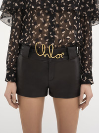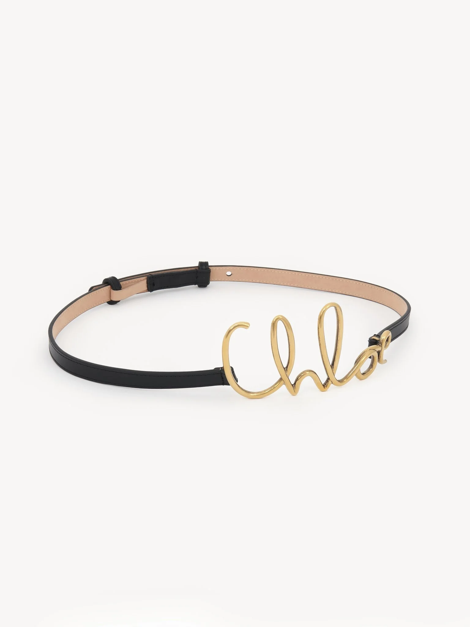 Chloé Iconic small belt inspired by a design rooted in the Maison's heritage. The soft calfskin band combines with a Chloé logo in gold brass and links to Chloé's jewelry line. Wear high on the waist or low on the hips. PRODUCT DETAILS Signature belt in soft calfskin & brass Internal & external lining: Calfskin Buckle: 100% Brass - S: 27.6-33.5" (70-85 cm) - M: 30.5-36.4" (77.5-92.5 cm) - L: 33.5-39.4" (85-100 cm) - Total length: 30" (76 cm) - Strap width: 0.7" (1.8 cm) - Chloé-logo buckle length: 5.9" (15 cm) - Chloé-logo buckle height: 2.6" (6.5 cm) - 7 adjustment holes placed at 1" (2.5 cm) intervals - Chloé-embossed logo - Thin leather belt - Collar stud closure - Wear on waist or hips This belt is made from calfskin. The leather is chosen with care and crafted by artisans in our workshops in Italy. Our leathers have a richness that makes them unique (patina, color variations, marks, distinctive features, etc.). For optimal quality and durability, wear your belt regularly. Avoid exposure to direct sunlight and heat. Avoid contact with water, alcohol, perfume, chlorine and abrasive surfaces. Store your belt inside a pouch or in its box. Leather specialist cleaning only. To make this product, Chloé worked with Leather Working Group (LWG) certified leather manufacturers. LWG certifies tanneries based on their water and energy usage, management of chemicals, solid waste, and wastewater. Color: Black Item code: CHC24AC066SFB001