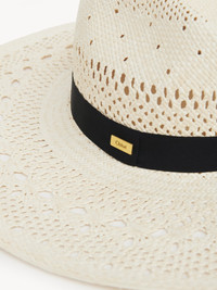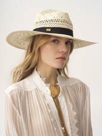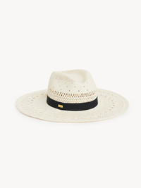 Chloe Panama hat in toquilla palm straw with lace-effect perforations. A contrasting silk ribbon contours the base, signed by a gold-tone Chloe logo plate. PRODUCT DETAILS Panama hat in 100% toquilla palm straw - S: 22" (56 cm) - M: 22.8" (58 cm) - Metal Chloe logo plate Color: White Item code: CH25AHP01PNM101