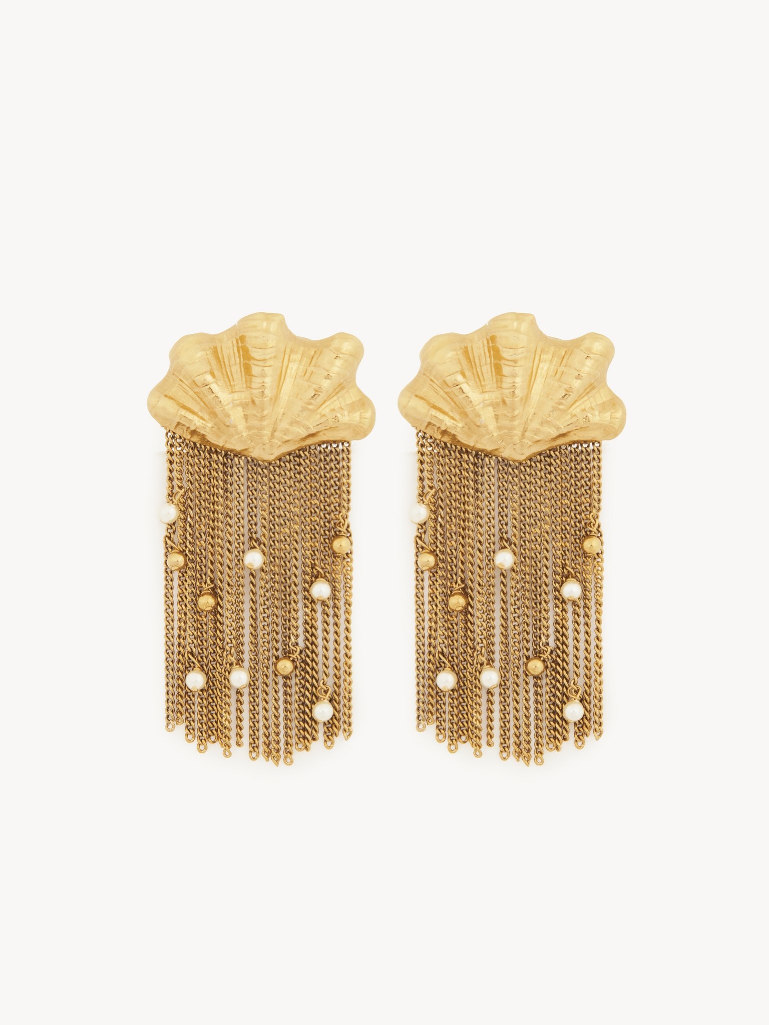 Chloe Shells earrings in vintage gold brass. Large shells are embellished with dangling chains and synthetic pearls for a variety of textures. A Chloe logo engraving finishes these earrings. PRODUCT DETAILS Earrings in brass & synthetic pearls - One size only - Suitable for pierced ears only - Pin & clip closure - Chloe logo engraving To ensure this item's quality and longevity, wear it regularly and avoid exposure to direct sunlight and heat. Avoid impact, and contact with water, perfume or chlorine. Store your jewel in its pouch and box when not in use. Color: Vintage Gold Item code: CHC25UFE26SYP9DC