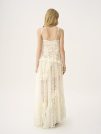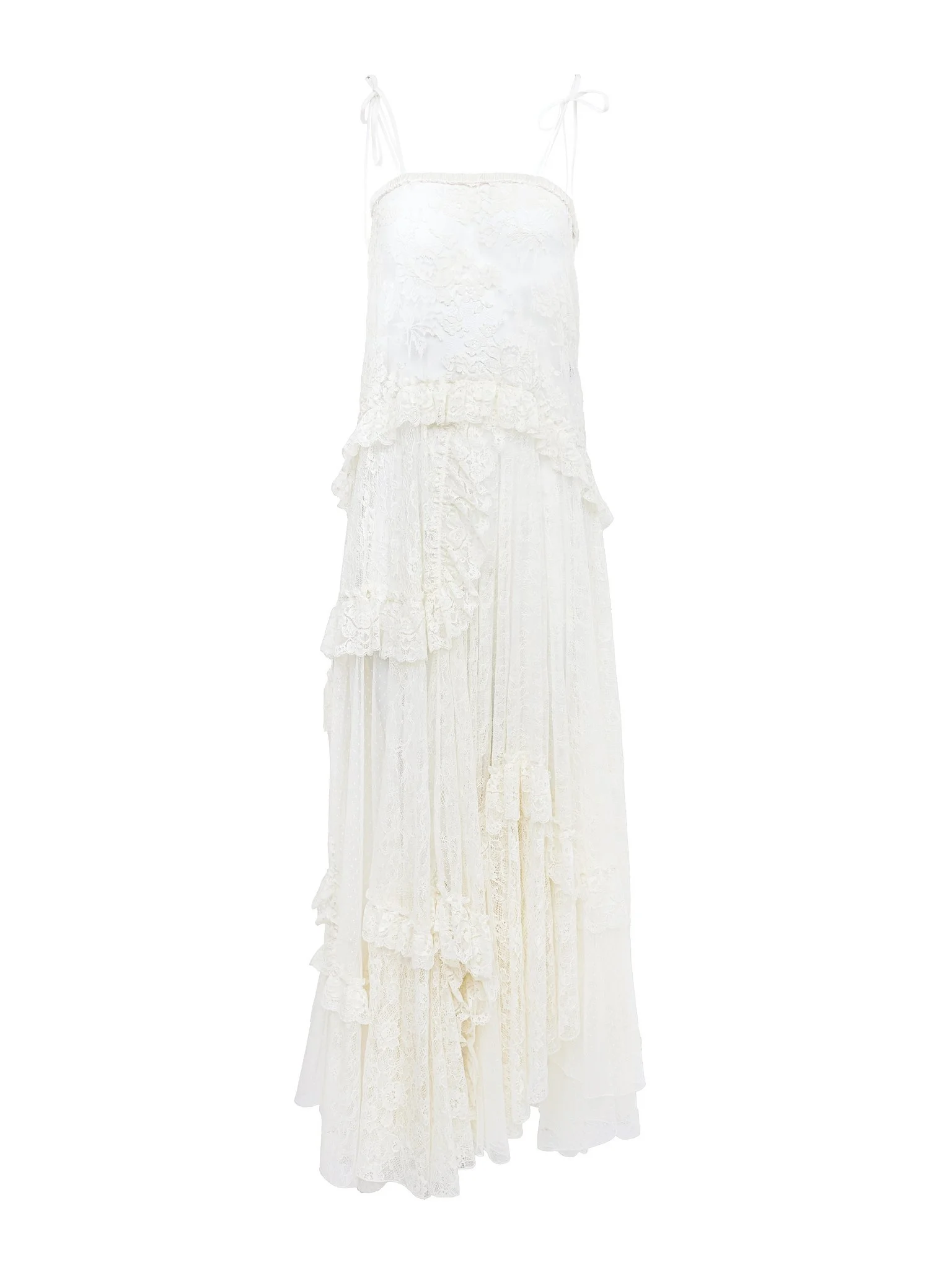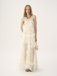 Thin-strap long dress in floral embroidered lace with ruffled trims and a fluid, gathered skirt. PRODUCT DETAILS Thin-strap long dress outer shell: 100% Silk Upper part: 82% Cotton, 18% Polyamide Lower part: 100% Polyamide Fit: fluid, long - The model is 5'10" (178 cm) and wears a prototype in size 36 - Long ruffle dress - Elastic ribbon at neckline - Thin straps knotted at shoulders Color: Iconic Milk Item code: CH25ARO40990107