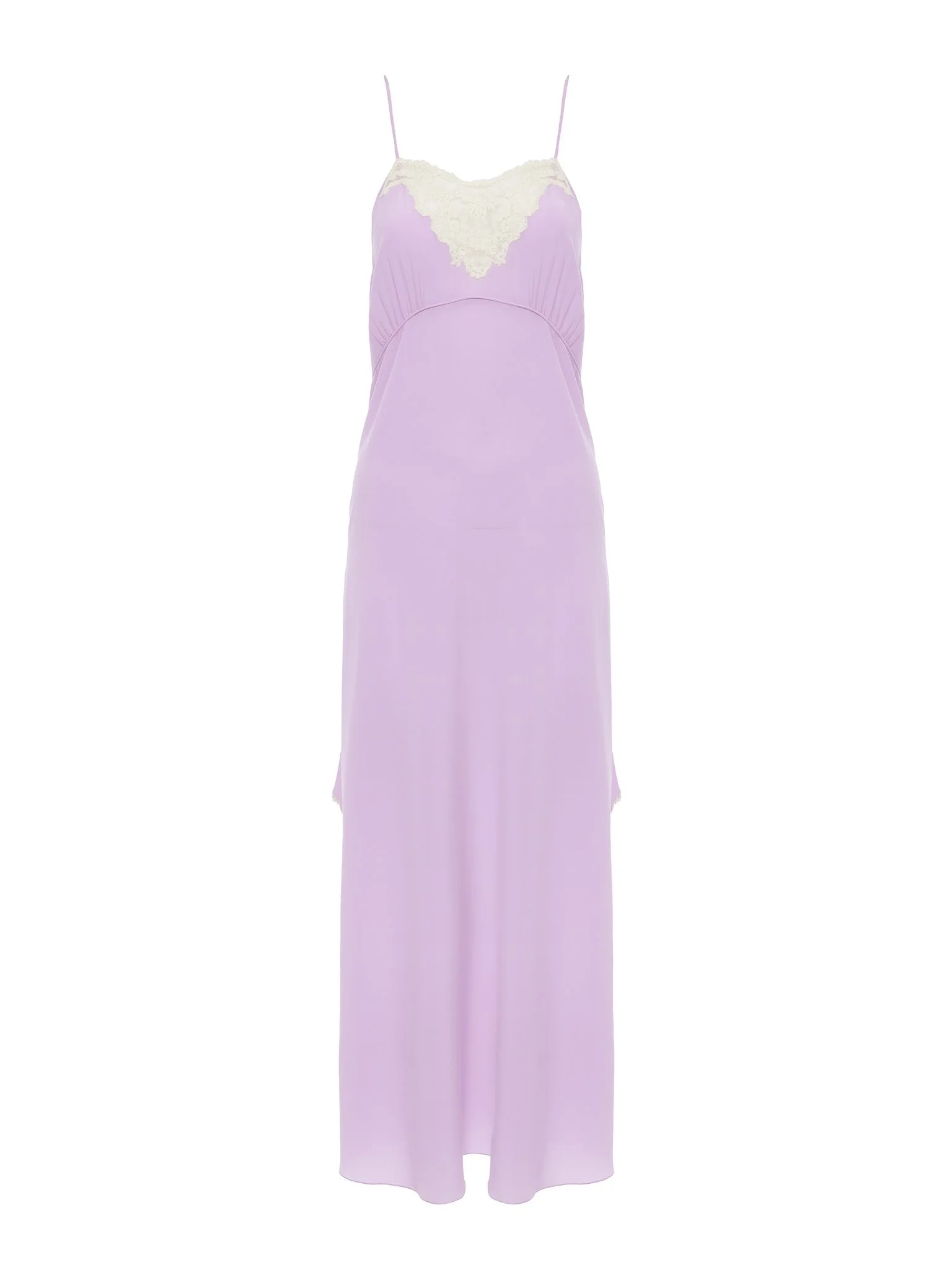 Thin-strap midi dress in organic silk crepe de chine with contrast lace inserts and gathered details. PRODUCT DETAILS Thin-strap midi dress outer shell: 100% Silk Lacework: 100% Polyester Fit: straight, midi length - The model is 5'10" (178 cm) and wears a prototype in size 36 - Lace-trimmed silk dress - Slips on Organic silk manufacturing restricts the use of pesticides, insecticides or harsh chemicals and incorporates methods that respect biodiversity, improve soil quality and reduce water consumption. Color: Creamy Lilac Item code: CH25ARO2407751H