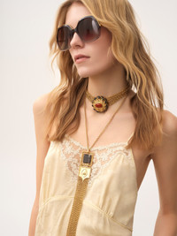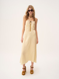 Thin-strap midi dress in organic silk with a roses jacquard, featuring lace inserts and gathered details. PRODUCT DETAILS Thin-strap midi dress outer shell: 100% Silk Lacework: 100% Polyester Fit: fluid, midi length - The model is 5'10" (178 cm) and wears a prototype in size 36 - Lace-trimmed silk dress - Slips on Organic silk manufacturing restricts the use of pesticides, insecticides or harsh chemicals and incorporates methods that respect biodiversity, improve soil quality and reduce water consumption. Color: Powder Yellow Item code: CH25ARO24115753