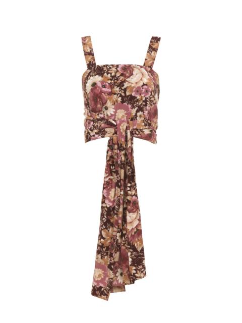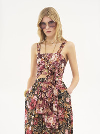 Cropped front-tie tank top in organic silk crepe de chine with a roses print inspired by the Maison's Archives, featuring a square neckline and long ties knotted at the front. PRODUCT DETAILS Cropped front-tie tank top outer shell: 100% Silk Fit: cropped, fitted - The model is 5'10" (178 cm) and wears a prototype in size S - Floral-print tank top - Slips on Care: dry cleaning only Organic silk manufacturing restricts the use of pesticides, insecticides or harsh chemicals and incorporates methods that respect biodiversity, improve soil quality and reduce water consumption. This product was made in collaboration with Akanjo, a certified WFTO supplier. Akanjo is a social enterprise located in Madagascar that places equal pay and employees' health & wellbeing at the core of their priorities. A long-standing partner of Chloe for 15 years, Akanjo is also committed to training and promoting craftsmanship. Color: Maroon Pink Item code: CH25UHT254926BI
