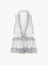 DESCRIPTION Sleeveless V-neck top in washed silk satin with a silk-mix lining, featuring lace trims and dangling ties with gold-tone sphere charms. PRODUCT DETAILS Sleeveless top outer shell: 100% Silk Lining: 76% Acetate fiber, 24% Silk Main lacework: 90% Cotton, 10% Polyamide Secondary lacework: 80% Cotton, 20% Polyamide Fit: fluid - The model is 5'10" (178 cm) and wears a prototype in size 36 - Tie-front silk top - Concealed mother-of-pearl button at chest - Dangling ties with hammered metal tips & sphere charms This product was made in collaboration with Akanjo, a certified WFTO supplier. Akanjo is a social enterprise located in Madagascar that places equal pay and employees' health & wellbeing at the core of their priorities. A long-standing partner of Chloe for 15 years, Akanjo is also committed to training and promoting craftsmanship. Color: Sweet Grey Item code: CH25WHT2400800N CARE INSTRUCTIONS To preserve the integrity of your garment, please refrain from washing, entrusting its care to professional cleaning services for optimal maintenance. This garment cannot withstand any bleaching agent. To maintain its shape, gently iron this garment at a maximum sole plate temperature of 110°C, taking care to avoid any harsh pressure while ironing. Entrust this garment to a specialist for mild cleaning with tetrachloroethylene and solvent F, ensuring its delicate nature is maintained with the most care. To maintain its delicate nature, do not wet clean this garment. To best preserve its form and texture, please do not tumble dry this garment. TRACEABILITY Better traceability is central to improving our materials as well as social and environmental practices. Dyeing: Italy Finishing: Italy Weaving: China