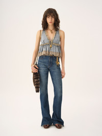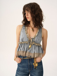DESCRIPTION Sleeveless V-neck top in washed silk satin with a silk-mix lining, featuring lace trims and dangling ties with gold-tone sphere charms. PRODUCT DETAILS Sleeveless top outer shell: 100% Silk Lining: 76% Acetate fiber, 24% Silk Main lacework: 90% Cotton, 10% Polyamide Secondary lacework: 80% Cotton, 20% Polyamide Fit: fluid - The model is 5'10" (178 cm) and wears a prototype in size 36 - Tie-front silk top - Concealed mother-of-pearl button at chest - Dangling ties with hammered metal tips & sphere charms This product was made in collaboration with Akanjo, a certified WFTO supplier. Akanjo is a social enterprise located in Madagascar that places equal pay and employees' health & wellbeing at the core of their priorities. A long-standing partner of Chloe for 15 years, Akanjo is also committed to training and promoting craftsmanship. Color: Ash Blue Item code: CH25WHT24008466 CARE INSTRUCTIONS To preserve the integrity of your garment, please refrain from washing, entrusting its care to professional cleaning services for optimal maintenance. This garment cannot withstand any bleaching agent. To maintain its shape, gently iron this garment at a maximum sole plate temperature of 110°C, taking care to avoid any harsh pressure while ironing. Entrust this garment to a specialist for mild cleaning with tetrachloroethylene and solvent F, ensuring its delicate nature is maintained with the most care. To maintain its delicate nature, do not wet clean this garment. To best preserve its form and texture, please do not tumble dry this garment. TRACEABILITY Better traceability is central to improving our materials as well as social and environmental practices. Dyeing: Italy Finishing: Italy Weaving: China Manufacturing : Madagascar
