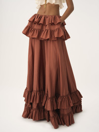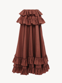 Tiered maxi skirt in washed light silk taffeta with generous ruffles. PRODUCT DETAILS Tiered maxi skirt outer shell: 100% Silk Lining: 76% Acetate fiber, 24% Silk Fit: fluid - The model is 5'10" (178 cm) and wears a prototype in size 36 - Tiered silk skirt - Side zipper This product was made by Marie Helene Couture, a long-standing partner of Chloe based in Morlaas, France. Marie Helene Couture excels in the specialized technique of couture "flou". Their expertise aligns with the rigorous standards set by the "metiers de la mode, vetement flou" certification, ensuring a high level of professional aptitude in this delicate and skilled art form. Color: Cedar Pink Item code: CH25WJU371026AG