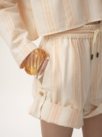Drawstring shorts in soft striped organic cotton with buttoned turn-ups, an elasticated drawstring waist with Chloe-engraved tips, and Chloe logo embroidery at the back. PRODUCT DETAILS Drawstring shorts outer shell: 100% Cotton Buttons: 100% Water buffalo horn Fit: casual - The model is 5'10" (178 cm) and wears a prototype in size 36 - Striped cotton shorts - Elasticated drawstring waist with Chloe-engraved tips - Side pockets - Buttoned tabs at sides to fasten turn-up hem An organic cotton farming system sustains the health of soils, ecosystems and people by eliminating the use of toxic and persistent organic pollutants and increasing water conservation. Color: White Pink Item code: CH25ASH020826A0