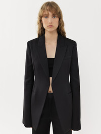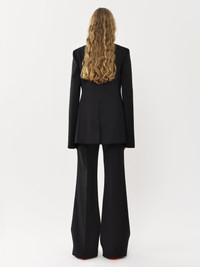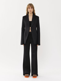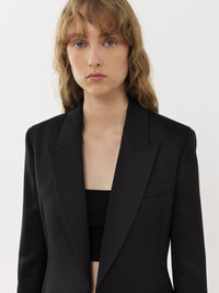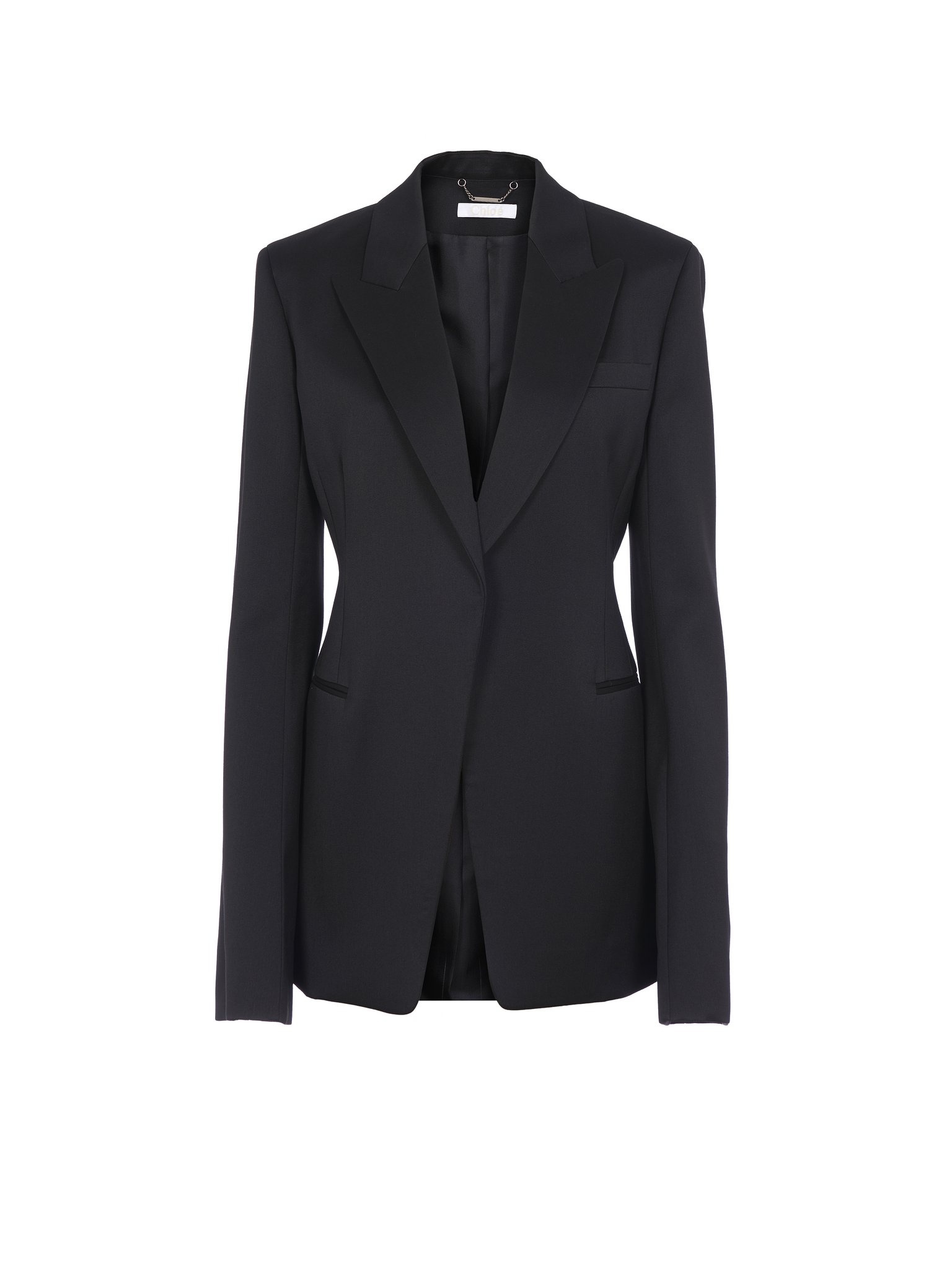 Tailored from a compact wool silk crêpe, this tuxedo jacket has a fitted silhouette. Single-breasted and buttonless, the jacket's clean lines are best paired with the matching flared pants. PRODUCT DETAILS Tuxedo jacket main material: 86% Wool, 14% Silk Lining: 100% Silk Care: dry cleaning only Fit: fitted - The model is 5’10” (178 cm) and wears a prototype in size 36 - Wool jacket - Buttonless - Side pockets - Chest pocket Color: Black Item code: CHC23UVE03063001