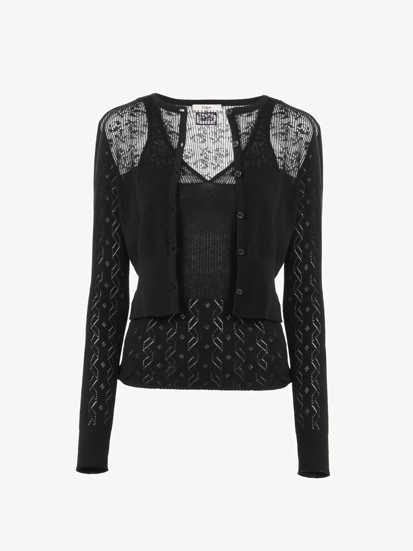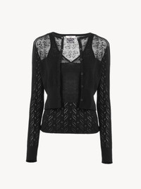 DESCRIPTION Twin set of a tank top and cardigan in a cotton pointelle knit with lace-effect stitches and ribbed trims. Mother-of-pearl buttons detail the cardigan, while a Chloe logo patch signs the back of both pieces. PRODUCT DETAILS Twin set outer shell: 100% Cotton Ribbing: 87% Cotton, 9% Polyamide, 4% Elastane Separate lining inner: 100% Cotton Buttons: 100% Mother-of-pearl Fit: straight - The model is 5'10" (178 cm) and wears a prototype in size XS - Knitted tank top & cardigan twin set - Mother-of-pearl buttons through cardigan - Chloe logo patch at back Color: Black Item code: CH25AMX03611001 CARE INSTRUCTIONS To preserve the integrity of your garment wash it at a maximum of 30°C, using a very mild process to protect its delicate nature. This garment cannot withstand any bleaching agent. To maintain its shape, gently iron this garment at a maximum sole plate temperature of 110°C, taking care to avoid any harsh pressure while ironing. Entrust this garment to a specialist for mild cleaning with tetrachloroethylene and solvent F, ensuring its delicate nature is maintained with the most care. To maintain its delicate nature, do not wet clean this garment. To best preserve its form and texture, please do not tumble dry this garment.