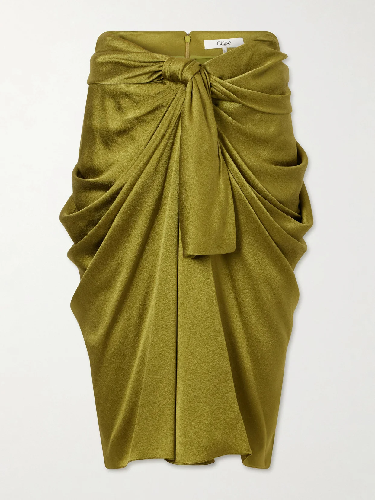 Draping is central to the feminine vision of Chloe. Crafted from lustrous silk satin, this midi skirt is gathered at the waist and secured with a soft knot that releases into fluid folds. The fabric falls in gentle drapes along the silhouette, enhancing the design's refined character.