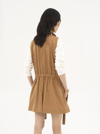 Belted utilitarian vest in light organic cotton gabardine, featuring oversized flap pockets, engraved horn buttons and an integrated belt finished with gold-tone metal tips. A gold metal Chloe logo triangle signs the left pocket. PRODUCT DETAILS Utilitarian vest outer shell: 100% Cotton Lining: 100% Cotton Buttons: 100% Horn Fit: casual - The model is 5'10" (178 cm) and wears a prototype in size 40 - Belted vest - Engraved horn buttons through front - 2 chest flap pockets - 2 front flap pockets with top & side entry - Integrated drawstring belt with buckles - Gold metal Chloe logo triangle at left pocket Care: dry cleaning only An organic cotton farming system sustains the health of soils, ecosystems and people by eliminating the use of toxic and persistent organic pollutants and increasing water conservation. Color: Golden Brown Item code: CH25UGI1011820Y