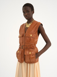 Belted utilitarian vest in soft leather with a glossy finish, featuring a V-neckline, bellows pockets and gold-toned military buttons. PRODUCT DETAILS Utilitarian vest main material: 100% Lambskin Lining: 62% Viscose, 38% Cotton Pocket lining: 100% Cotton Care: leather specialist only Fit: straight, sleeveless - The model is 5'10" (178 cm) and wears a prototype in size 36 - Leather jacket - Front zipper - Buckled leather belt - 4 maxi pockets with metal buttons To make this product, Chloé worked with Leather Working Group (LWG) certified leather manufacturers. LWG certifies tanneries based on their water and energy usage, management of chemicals, solid waste, and wastewater. Color: Caramelo Item code: CHC24ACV04213242