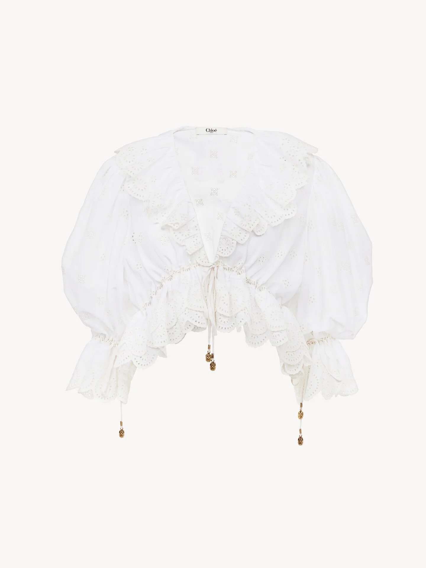 DESCRIPTION Ruffle top in organic cotton voile with floral broderie anglaise, a deep V-neck, flouncy trims and dangling ties with gold-tone metal tips and pineapple charms. PRODUCT DETAILS V-neck ruffle top outer shell: 100% Cotton Embroidery thread: 80% Cotton, 20% Polyester Fit: gathered - The model is 5'10" (178 cm) and wears a prototype in size 36 - Long-sleeve top - Drawstring waist & cuffs with hammered metal tips & gold-tone pineapple charms An organic cotton farming system sustains the health of soils, ecosystems and people by eliminating the use of toxic and persistent organic pollutants and increasing water conservation. Color: Iconic Milk Item code: CH25AHT47993107 CARE INSTRUCTIONS To preserve the integrity of your garment, please refrain from washing, entrusting its care to professional cleaning services for optimal maintenance. This garment cannot withstand any bleaching agent. To maintain its shape, gently iron this garment at a maximum sole plate temperature of 110°C, taking care to avoid any harsh pressure while ironing. Entrust this garment to a specialist for mild cleaning with tetrachloroethylene and solvent F, ensuring its delicate nature is maintained with the most care. To maintain its delicate nature, do not wet clean this garment. To best preserve its form and texture, please do not tumble dry this garment. TRACEABILITY Better traceability is central to improving our materials as well as social and environmental practices. Dyeing: Italy Finishing: Italy Weaving: Italy